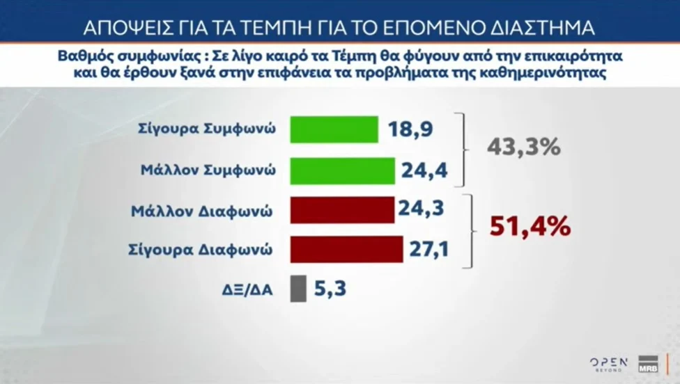 Το 51,4% διαφωνεί με την άποψη ότι θα Τέμπη θα φύγουν από την επικαιρότητα σύντομα, ενώ το 43,3% συμφωνεί με αυτή την άποψη.