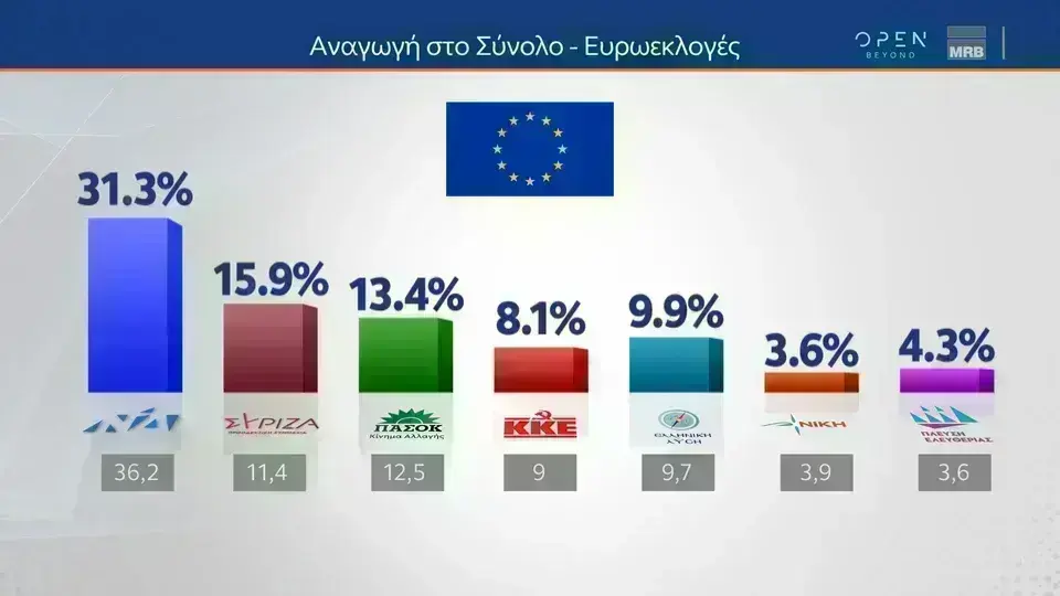 Στην αναγωγή στο σύνολο, ενόψει ευρωεκλογών, η ΝΔ κινείται στο 31,3% διασφαλίζοντας διαφορά 15,5 μονάδων από τον δεύτερο ΣΥΡΙΖΑ που συγκεντρώνει ποσοστό 15,9%. Στην τρίτη θέση ξανά το ΠΑΣΟΚ με 13,4%. Τέταρτη η Ελληνική Λύση με 9,9% και ακολουθεί το ΚΚΕ με 8,1%,. Αίσθηση προκαλεί η άνοδος της Πλεύσης που φτάνει το 4,3% και η Νέα Αριστερά που κινείται στο 3,8%. Ακολουθεί η Νίκη με 3,6%.