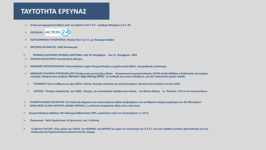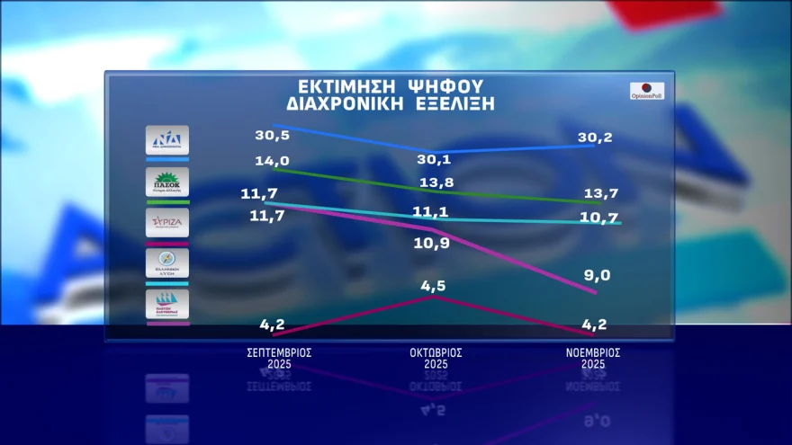 Μόνον οριακές διαφοροποιήσεις στους πολιτικούς συσχετισμούς σε σχέση με τον Οκτώβριο βλέπει η Opinion Poll στη δημοσκόπηση που παρουσιάστηκε στο κεντρικό δελτίο του Action 24: Η Ν.Δ βρίσκεται στην εκτίμηση ψήφου στο 30.2% ( + 0.1% σε σχέση με την έρευνα Οκτωβρίου) και σε απόσταση 16.5% από το σταθερά δεύτερο ΠΑΣΟΚ που μετρήθηκε στο 13.7% από 13.8%.