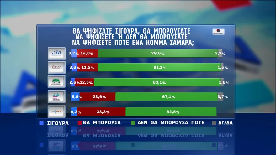 Τα αποτελέσματα αυτά οδηγούν στην εξής κατανομή εδρών σύμφωνα με την ανάλυση της Opinion Poll: Ν.Δ 126, ΠΑΣΟΚ 44, Ελληνική Λύση 34, Πλεύση Ελευθερίας 29, Κ.Κ.Ε 27, Φωνή Λογικής 15, ΣΥΡΙΖΑ 14, ΜεΡΑ25 11. Προκύπτει δηλαδή 8κομματική Βουλή , με την Ν.Δ να απέχει αυτή την στιγμή από την αυτοδυναμία, αλλά με βάση αυτή την κατανομή εδρών δεν προκύπτει κυβέρνηση χωρίς την συμμετοχή της Ν.Δ, όπως σημειώνουν οι αναλυτές της εταιρείας.