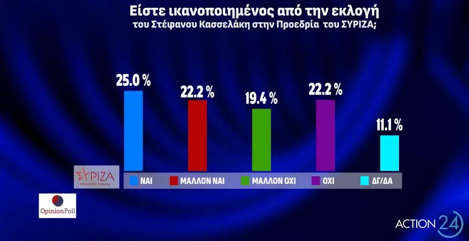Σύμφωνα με τη μέτρηση, ένα ποσοστό 47,2% δηλώνει ικανοποιημένο και μάλλον ικανοποιημένο από την εκλογή του Στέφανου Κασσελάκη στην ηγεσία του ΣΥΡΙΖΑ, έναντι 41,6% που δηλώνει όχι και μάλλον όχι.