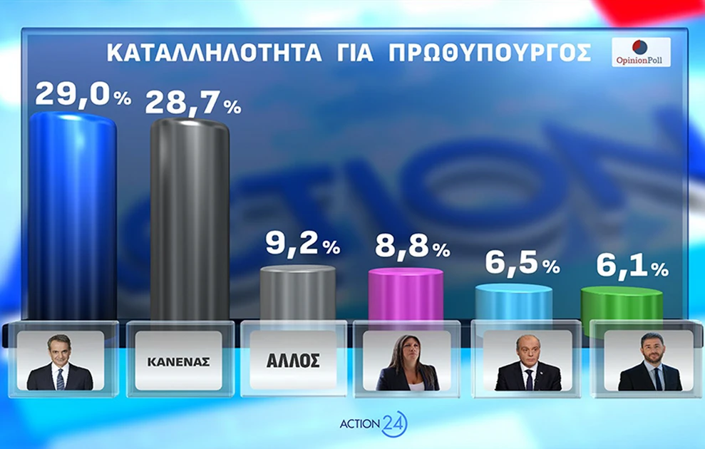 Πιο αναλυτικά, η Νέα Δημοκρατία τόσο στην πρόθεση ψήφου, όσο και στην εκτίμηση, εμφανίζεται πρώτη, ενώ στη δεύτερη θέση ακολουθεί το ΠΑΣΟΚ.
