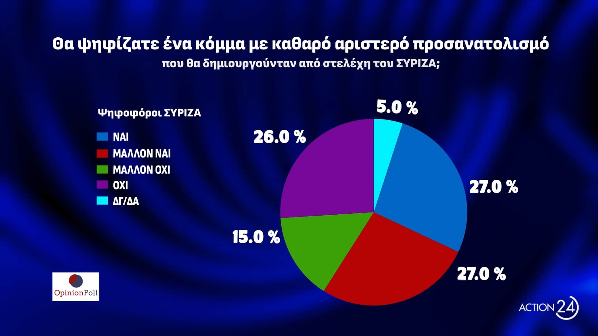 Για το αν οι σημερινοί ψηφοφόροι του ΣΥΡΙΖΑ θα ψήφιζαν ένα κόμμα με «καθαρό αριστερό προσανατολισμό», ναι ή μαλλον ναι απαντά το 54%.