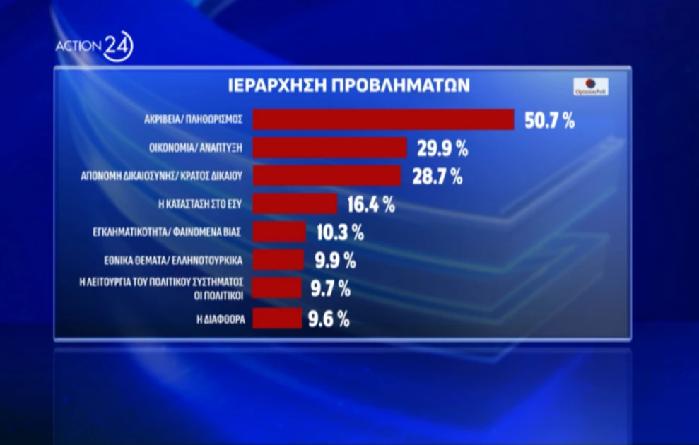 Στην ερώτηση «σε ποια θέματα πρέπει να ρίξει βάρος η κυβέρνηση» το 44,4% απάντησε αντιμετώπιση της ακρίβειας, το 22,6% στην τραγωδία των Τεμπών, το 12,8% στην αύξηση των εισοδημάτων, το 12,4% στη βελτίωση του ΕΣΥ, το 11,8% στις μεταφορές, το 11,1% στη θωράκιση της δικαιοσύνης, το 6,6% στα εθνικά θέματα και το 6,1% στην αντιμετώπιση των παθογενειών του κράτους.