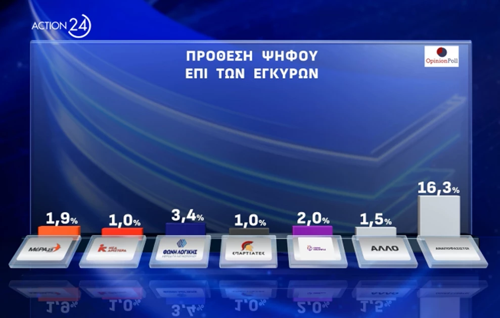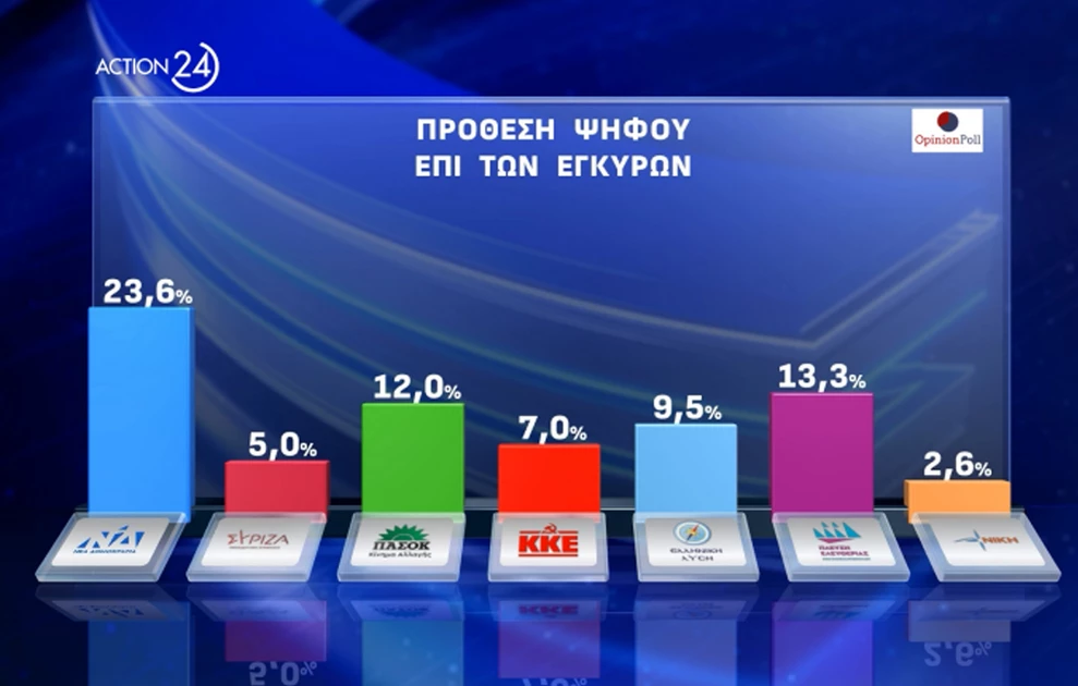 Στην πρόθεση ψήφου η Νέα Δημοκρατία εμφανίζεται πρώτη και με διαφορά, καθώς λαμβάνει 23,6%. Για τη δεύτερη θέση γίνεται μάχη όμως, με την Πλεύση Ελευθερίας να παίρνει 13,3%, ρίχνοντας στην τρίτη θέση το ΠΑΣΟΚ με 12%. Επίσης, ο ΣΥΡΙΖΑ φαίνεται να υποχωρεί ακόμα περισσότερο, λαμβάνοντας 5%, ενώ το κόμμα του Στέφανου Κασσελάκη δεν κερδίζει από την πτώση της πρώην παράταξης του, καθώς παίρνει 2% και μένει εκτός Βουλής.