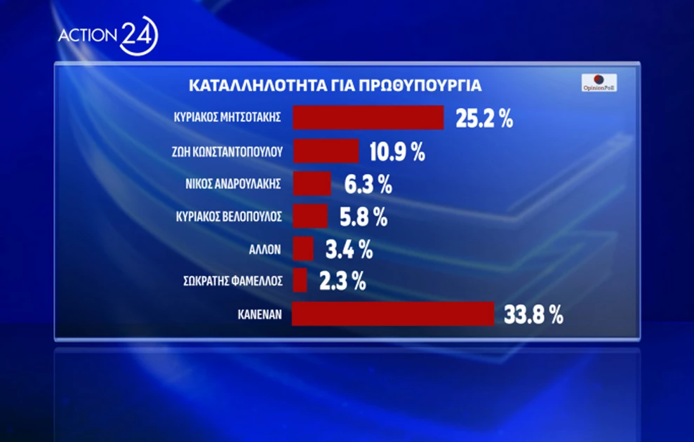 Ως προς την καταλληλότητα για πρωθυπουργία, ο Κυριάκος Μητσοτάκης είναι πρώτος, ενώ η Ζωή Κωνσταντοπούλου καταλαμβάνει τη δεύτερη θέση και ο Νίκος Ανδρουλάκης την τρίτη. Το ενδιαφέρον όμως, εντοπίζεται στην περίπτωση του Σωκράτη Φάμελλου, όπου όχι μόνο τερματίζει τελευταίος, αλλά χαμηλότερα και από την επιλογή «άλλος».