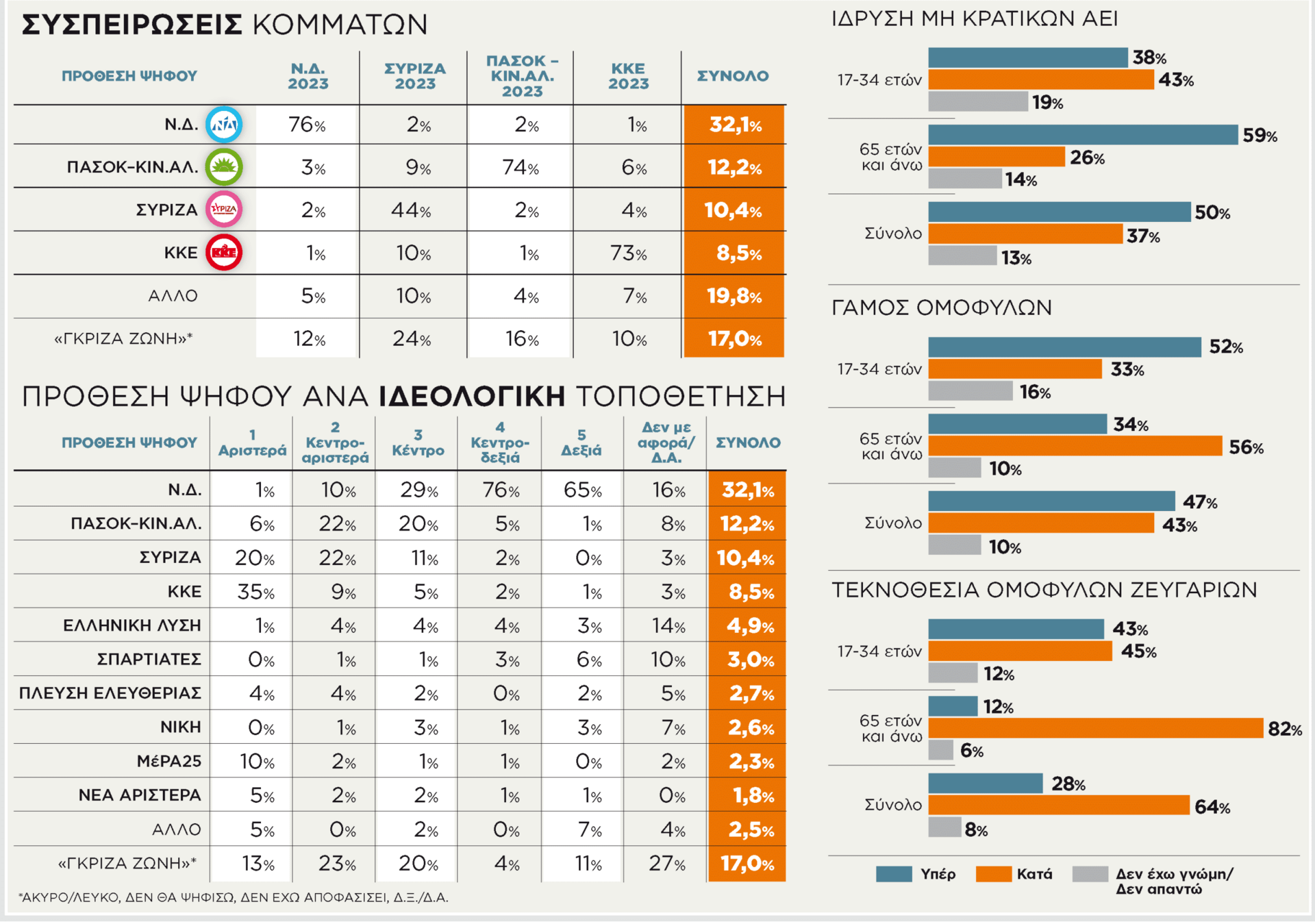 Ιδιαιτέρα εντυπωσιακό είναι το γεγονός ότι τα μεγαλύτερα ποσοστά τους η Ελληνική Λύση, οι «Σπαρτιάτες», η Νίκη αλλά και η Πλεύση Ελευθερίας τα εμφανίζουν στην κατηγορία εκείνη των πολιτών που δεν αυτοτοποθετούνται στο άξονα Αριστερά – Δεξιά, με 14%, 10%, 7% και 5% αντίστοιχα.