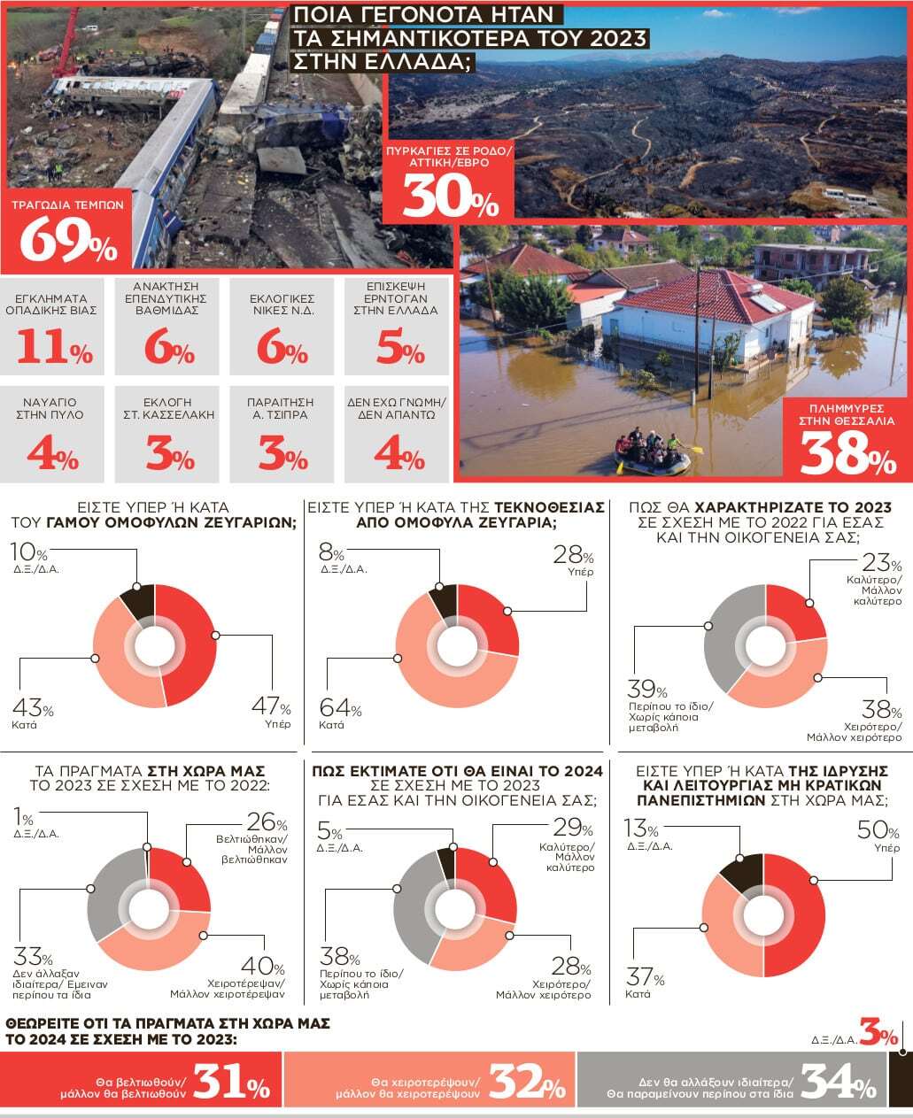 Σε ό,τι αφορά την προσωπική και οικογενειακή κατάσταση των ερωτηθέντων, το 2023 κρίνεται καλύτερο σε σχέση με το 2022 από το 23%, το 39% θεωρεί ότι ήταν ίδιο και το 38% το χαρακτηρίζει χειρότερο. Για την πορεία της χώρας το 2023 το 26% θεωρεί ότι βελτιώθηκαν τα πράγματα, το 33% έμειναν στα ίδια και το 40% ότι χειροτέρεψαν. Σημαντικότερο γεγονός του 2023 κρίνεται από το 69% η τραγωδία των Τεμπών ενώ ακολουθούν (με πολλαπλές επιλογές) οι πλημμύρες στη Θεσσαλία με 38%, οι πυρκαγιές με 30% και τα εγκλήματα οπαδικής βίας με 11%.