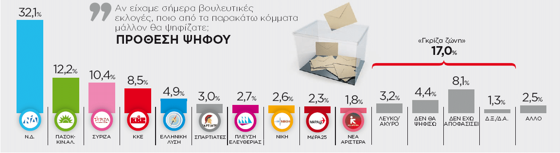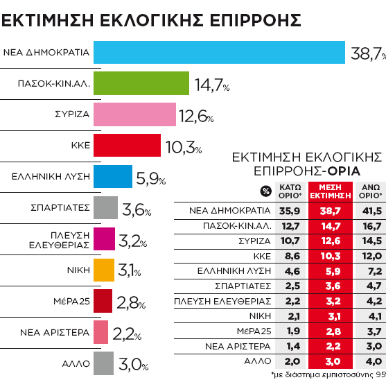 Αναλυτικότερα, στην εκτίμηση εκλογικής επιρροής η Ν.Δ. συγκεντρώνει 38,7%, το ΠΑΣΟΚ 14,7% και ακολουθούν ΣΥΡΙΖΑ με 12,6% και το ενισχυμένο ΚΚΕ στο 10,3%. Η Ελληνική Λύση 5,9%, οι Σπαρτιάτες 3,6%, η Πλεύση Ελευθερίας 3,2%, η Νίκη 3,1%, το ΜεΡΑ25 2,8% ενώ η Νέα Αριστερά δεν φαίνεται να πείθει στα πρώτα της βήματα λαμβάνοντας 2,2%.