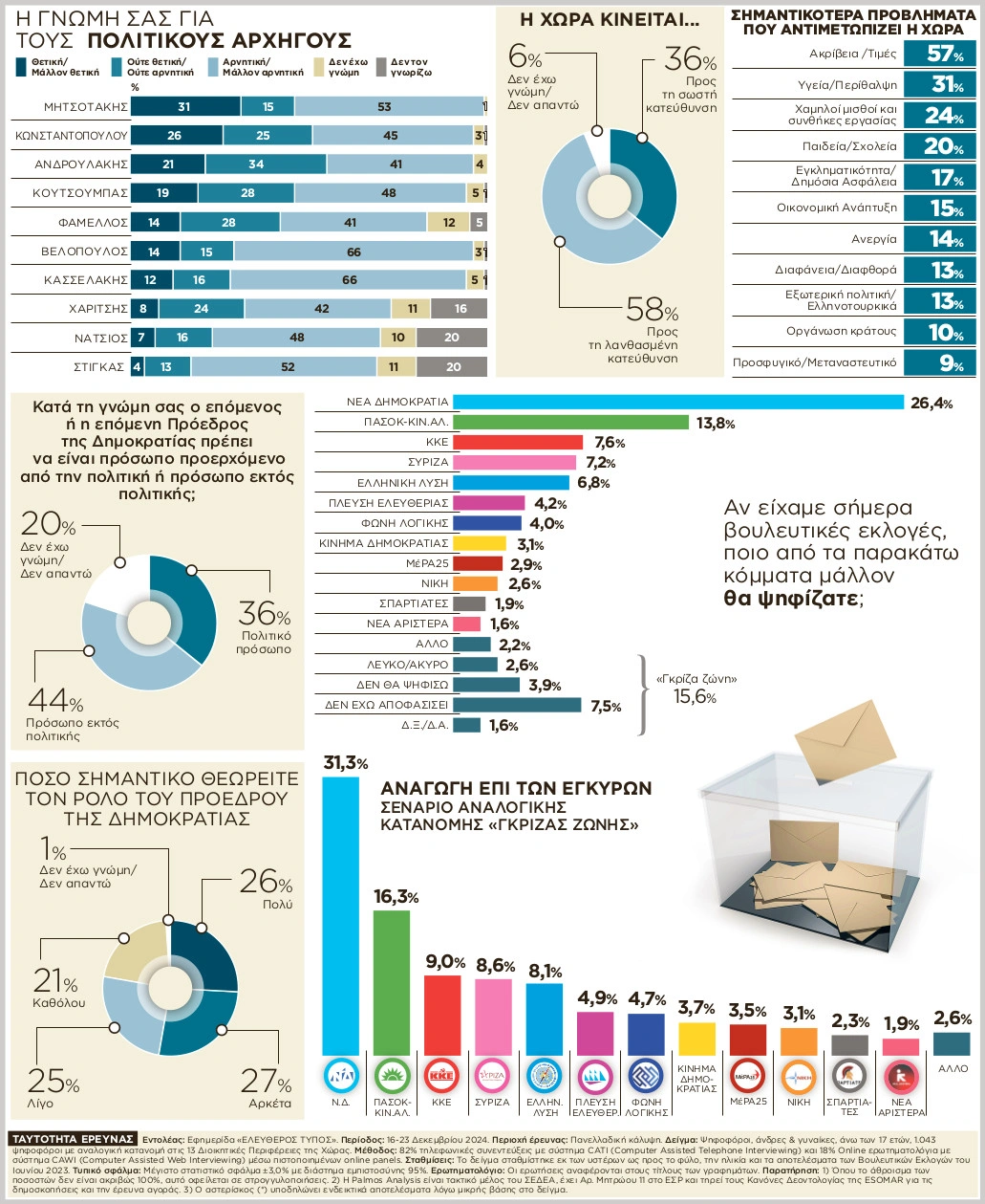 Κλείνοντας την αποτίμηση της τελευταίας δημοσκόπησης για το 2024, αξίζει να αναφερθούμε στο κύριο, εκτός απροόπτου, πολιτικό γεγονός του 2025: την εκλογή Προέδρου της Δημοκρατίας. Περίπου το ήμισυ του εκλογικού σώματος (46%) θεωρούν ότι ο θεσμός και ο ρόλος του Προέδρου της Δημοκρατίας είναι «Λίγο» (25%) ή «Καθόλου» (21%) σημαντικός, ενώ το 44% θεωρούν ότι ο επόμενος ή η επόμενη Πρόεδρος της Δημοκρατίας πρέπει να είναι πρόσωπο εκτός πολιτικής και μόλις το 36% θεωρούν ότι πρέπει να είναι πολιτικό πρόσωπο. Υπό το πρίσμα αυτό, καθίσταται ακόμα πιο σαφές ότι η διαδικασία εκλογής Προέδρου Δημοκρατίας θα εξελιχθεί κυρίως σε διαδικασία πολιτικών εντυπώσεων και τα κριτήρια που θα επικρατήσουν για τα πρόσωπα που θα προταθούν θα είναι κυρίως κριτήρια πολιτικών και εκλογικών ισορροπιών και συσχετισμών. Και επειδή ο νέος ή η νέα Πρόεδρος της Δημοκρατίας μπορεί πλέον να εκλεγεί και με απλή πλειοψηφία στη Βουλή και, συνεπώς, ο πρωθυπουργός έχει «και το καρπούζι και το μαχαίρι», το ενδιαφέρον εστιάζεται στο πρόσωπο που αυτός θα προτείνει. Θα είναι άραγε ένα πρόσωπο ευρύτερης αποδοχής, ενδεχομένως από τον χώρο του Κέντρου ή της Κεντροαριστεράς, ώστε να ενισχύσει τη στρατηγική επικράτησης στον μεσαίο -πολιτικά και κοινωνικά- χώρο και να πιέσει το ΠΑΣΟΚ-ΚΙΝΑΛ απομακρύνοντάς το από μια προσέγγιση με άλλες δυνάμεις της Κεντροαριστεράς με αφορμή την προεδρική εκλογή ή θα επιλέξει ένα πρόσωπο από την παραδοσιακή βάση της κεντροδεξιάς παράταξης για να ανακόψει τις διαρροές προς τα δεξιά και να ενισχύσει τις πιθανότητες επαναπροσέγγισης με δυσαρεστημένους ψηφοφόρους της παραδοσιακής δεξιάς βάσης του κόμματος;