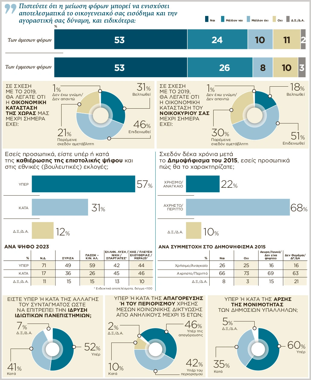 Το παλλαϊκό αίτημα για περαιτέρω μειώσεις φόρων προφανώς και έχει ως βάση την οικονομική κατάσταση των πολιτών. Και, σε αυτό το σημείο, χτυπάει καμπανάκι για την κυβέρνηση, καθώς μόλις το 31% θεωρεί πως έχει βελτιωθεί η οικονομική κατάσταση της χώρας από το 2019 έως σήμερα, το 22% την κρίνει αμετάβλητη, ενώ το 46% πιστεύει πως έχει επιδεινωθεί. Παράλληλα, μόνο το 18% βλέπει να έχει βελτιωθεί η προσωπική του οικονομική κατάσταση, το 30% λέει πως είναι αμετάβλητη και το 51% πως έχει επιδεινωθεί.