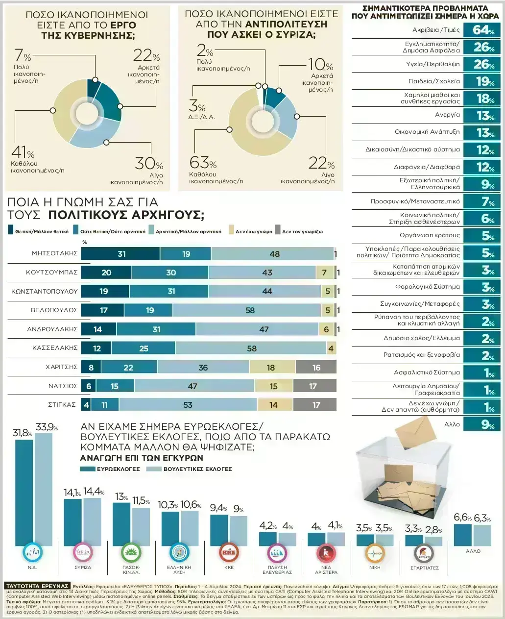 Την ίδια ώρα τόσο ο Στέφανος Κασσελάκης όσο και ο Νίκος Ανδρουλάκης δείχνουν ότι δεν διαθέτουν θετική απήχηση, ώστε να σταθούν ως αρχηγοί ενός κόμματος, που θα παίξει τον πραγματικό ρόλο της αξιωματικής αντιπολίτευσης στο πολιτικό σκηνικό, ανεξάρτητα από το ποιος θα είναι δεύτερος ή τρίτος στις ευρωεκλογές και κατατάσσονται αντίστοιχα στην πέμπτη και έκτη θέση της αξιολόγησης. Τέλος, ειδικά για τον ΣΥΡΙΖΑ είναι άκρως απογοητευτικό ότι το 85% των πολιτών δηλώνει καθόλου ή λίγο ικανοποιημένο από το αντιπολιτευτικό του έργο.