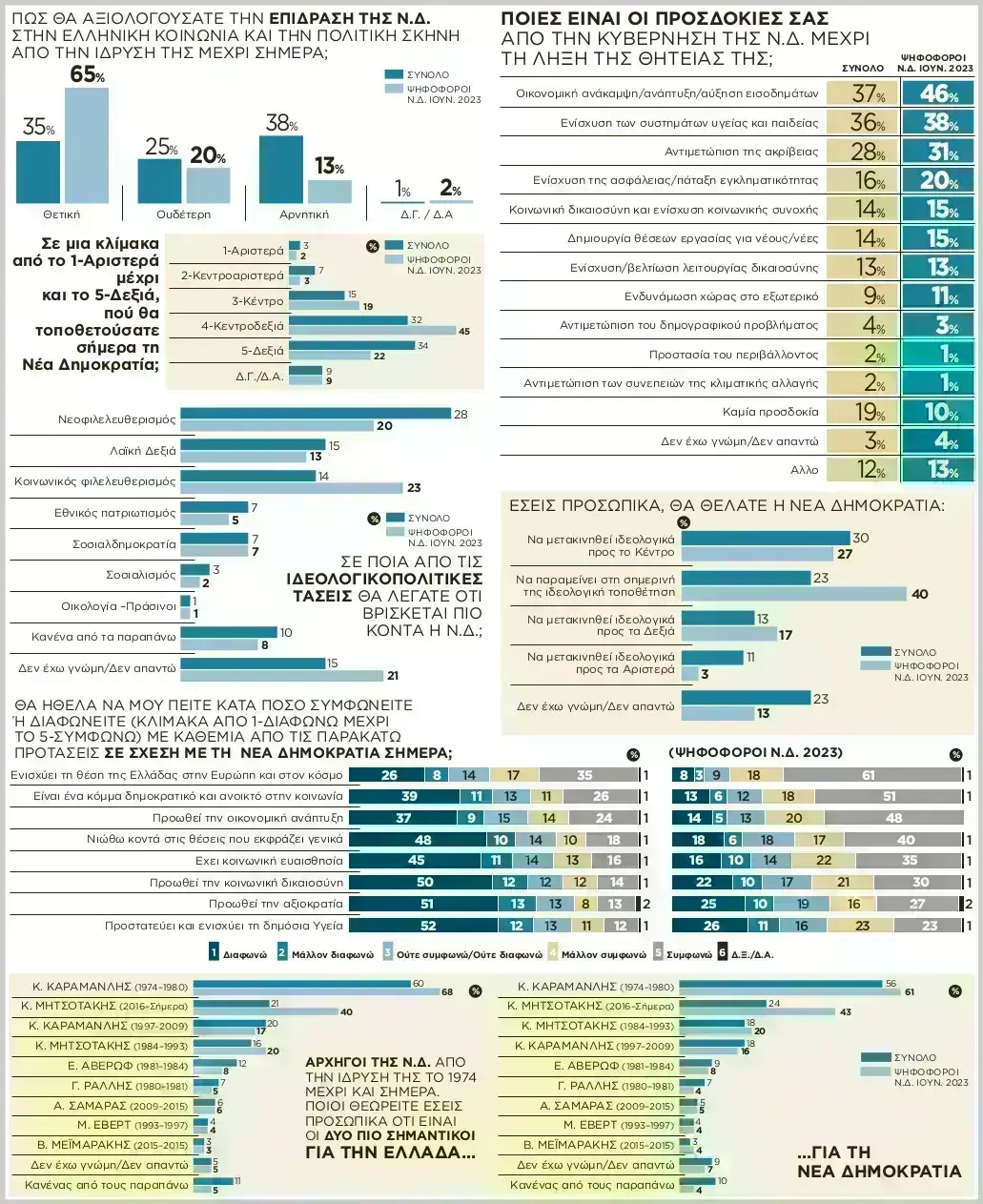 Καταρχάς το 35% των πολιτών και το 65% των ψηφοφόρων της Ν.Δ. αξιολογούν θετικά την επίδραση της κεντροδεξιάς παράταξης στην ελληνική κοινωνία και την πολιτική σκηνή από την ίδρυσή της έως σήμερα.