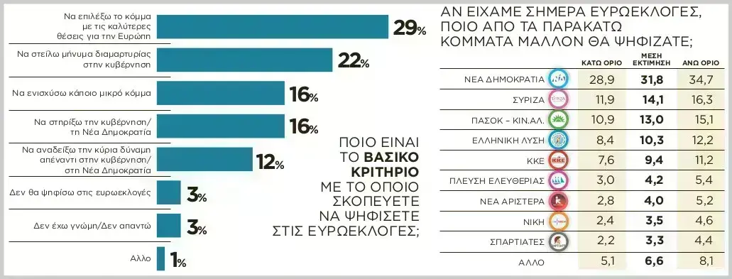 ΣΕ ΚΑΘΕ περίπτωση, οι ευρωεκλογές μόνο ατζέντα ευρωπαϊκών θεμάτων δεν θα έχουν. Μόλις το 30% των ψηφοφόρων αναφέρει ότι το βασικό κριτήριο για την ψήφο τους τον Ιούνιο θα είναι οι θέσεις των κομμάτων για την Ευρώπη. Η μεγάλη πλειοψηφία θα κατευθυνθεί προς τις κάλπες με στόχο να στείλει μηνύματα παντού: από το να τιμωρήσει ή να επιβραβεύσει την κυβέρνηση μέχρι το να ενισχύσει κάποιο μικρότερο κόμμα ή να καθορίσει τον κύριο αντίπαλο της Ν.Δ. στις επόμενες βουλευτικές κάλπες, όποτε κι αν στηθούν.
