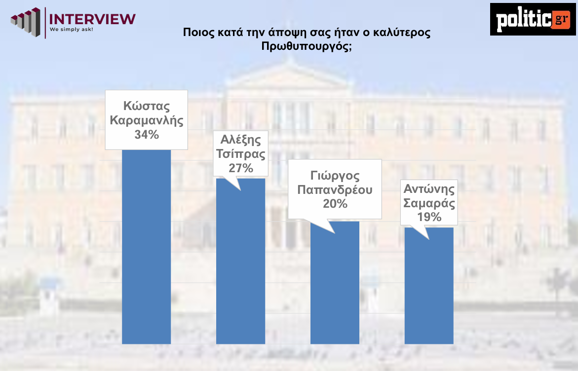 Ειδικότερα, στην ερώτηση «Ποιος κατά την άποψή σας ήταν ο καλύτερος πρωθυπουργός» το 34% απαντά ο Κώστας Καραμανλής και έπονται ο Αλέξης Τσίπρας (θητεία 2015 – 2019) με 27%, ο Γιώργος Παπανδρέου (θητεία 2009 – 2011) με 20% και ο Αντώνης Σαμαράς (θητεία 2012 – 2015) με 19%.