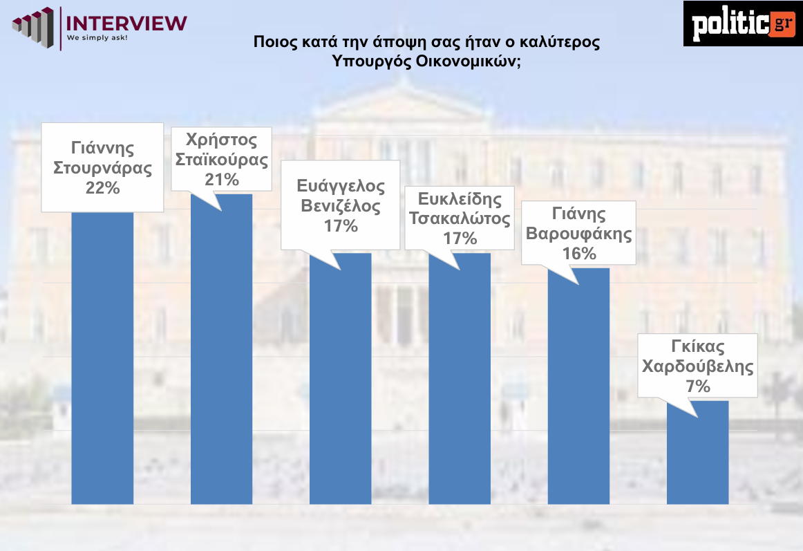 Όσον αφορά τους «τσάρους» της οικονομίας, ο Γιάννης Στουρνάρας (2012-2014) με 22% θωρείται ο «καλύτερος υπουργός Οικονομικών» και ακολουθεί σε απόσταση αναπνοής Χρήστος Σταϊκούρας (2019-2023) με 21%. Ως τρίτος καλύτερος παρουσιάζεται ο Ευάγγελος Βενιζέλος (θητεία 2011 – 2012) με 17%, τέταρτος ο Ευκλείδης Τσακαλώτος ο οποίος διετέλεσε υπουργός της κυβέρνησης Τσίπρα (17%) και πέμπτος ο Γιάνης Βαρουφάκης (16%), αντιστοίχως της κυβέρνησης Αλέξη Τσίπρα. Τελευταίος εμφανίζεται ο Γκίκας Χαρδούβελης (7%), ο οποίος διετέλεσε υπουργός της κυβέρνησης Αντώνη Σαμαρά.