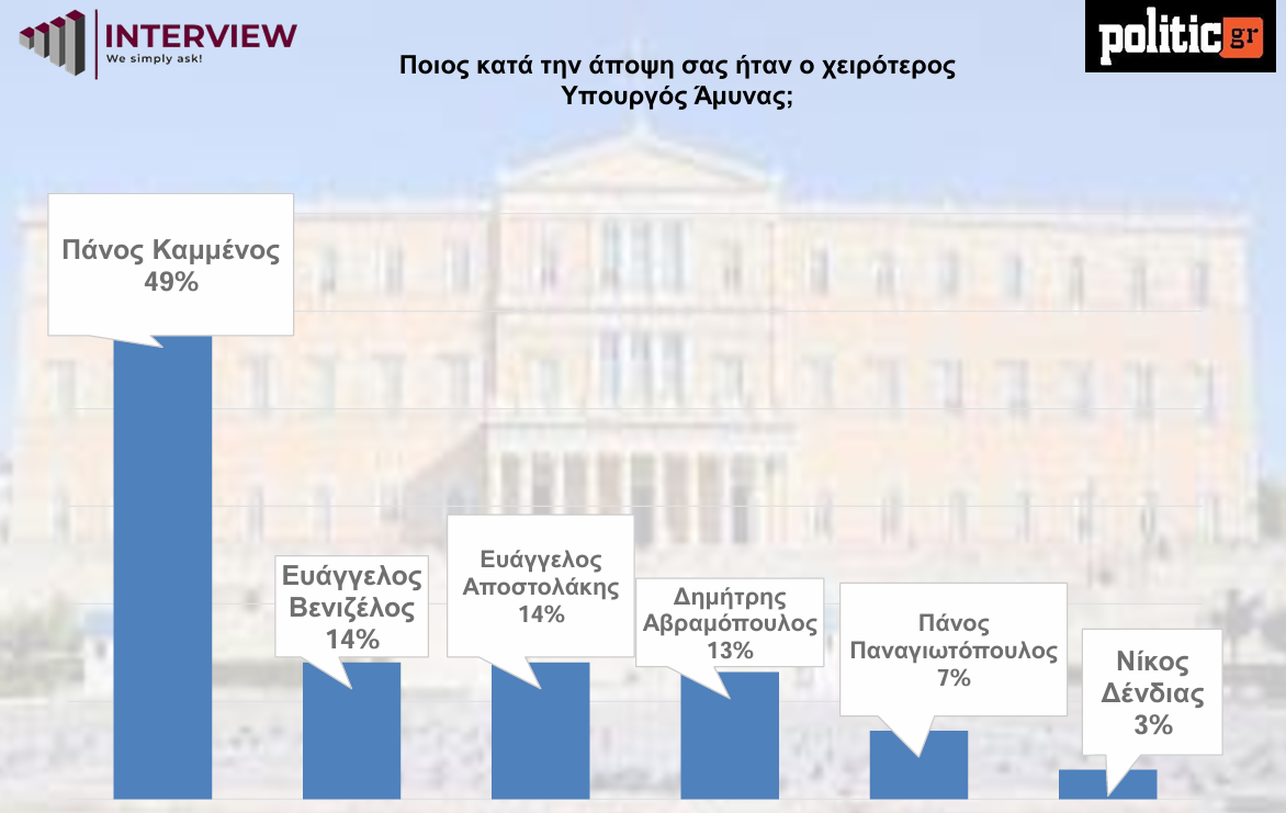 Σχεδόν ένας στους δύο λέει ότι ο Πάνος Καμμένος είναι ο χειρότερος Υπουργός Άμυνας. Ακολουθούν οι: Ευάγγελος Βενιζέλος και Ευάγγελος Αποστολάκης με 14%, Δημήτρης Αβραμόπουλος με 13%, Πάνος Παναγιωτόπουλος με 7% και ο Νίκος Δένδιας με 3%.