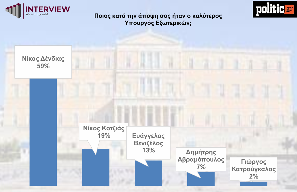 Όσον αφορά την άσκηση της εξωτερικής πολιτικής, «καλύτερος υπουργός Εξωτερικών» με αρκετή διαφορά από τον δεύτερο, είναι σύμφωνα με την έρευνα, ο Νίκος Δένδιας με 59% την περίοδο 2019 – 2023. Δεύτερος εμφανίζεται ο Νίκος Κοτζιάς (19%) την περίοδο 2015 – 2018 και τρίτος ο Ευάγγελος Βενιζέλος (13%) ο οποίος διετέλεσε υπουργός της κυβέρνησης Αντ. Σαμαρά. Ακολουθούν ο Δημήτρης Αβραμόπουλος (τον οποίο διαδέχτηκε ο Ευάγγελος Βενιζέλος) με 7% (θητεία 2012 – 2013), και τελευταίος είναι ο Γιώργος Κατρούγκαλος με 2%, ο οποίος διετέλεσε Υπουργός (Φεβρουάριος 2019 – Ιούλιος 2019) της κυβέρνησης Τσίπρα.