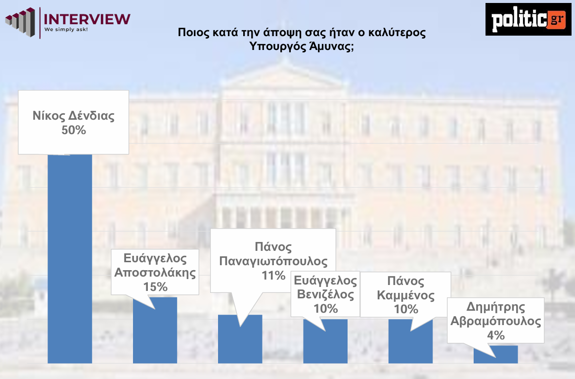 Όσον αφορά τη διοίκηση των Ενόπλων Δυνάμεων της χώρας, ένας στους δύο λέει ότι καλύτερος υπουργός Εθνικής Άμυνας ήταν ο Νίκος Δένδιας (2014-2015). Δεύτερος με αρκετή απόσταση είναι ο Ευάγγελος Αποστολάκης (15%) επί πρωθυπουργίας Αλ. Τσίπρα το 2019.