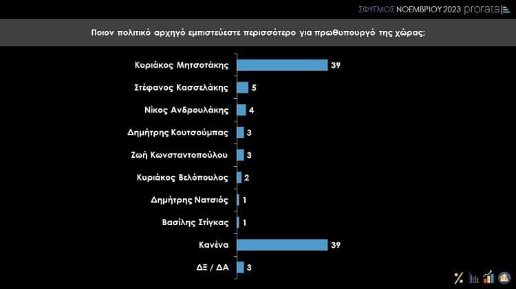 Ως προς τις εντυπώσεις απέναντι στους πολιτικούς αρχηγούς, ο πρωθυπουργός, Κυριάκος Μητσοτάκης συγκεντρώνει θετικές κρίσεις από το 33% της κοινής γνώμης, ενώ έπονται ο Δημήτρης Κουτσούμπας (23%), ο Νίκος Ανδρουλάκης (18%), η Ζωή Κωνσταντοπούλου (15%), ο Κυριάκος Βελόπουλος (13%), ο Στέφανος Κασσελάκης (11%), ο Δημήτρης Νατσιός (4%) και ο Βασίλης Στίγκας (3%). Ως προς τον δείκτη εμπιστοσύνης σε σχέση με την πρωθυπουργία της χώρας ο Κυριάκος Μητσοτάκης (39%) υπερέχει με εξαιρετικά μεγάλη διαφορά των ανταγωνιστών του, με τον Στέφανο Κασσελάκη, το Νίκο Ανδρουλάκη και τον Δημήτρη Κουτσούμπα να συγκεντρώνουν ποσοστά χαμηλότερα του 6% στον σχετικό δείκτη. Ενδεικτικό της έντονης έλλειψης ανταγωνισμού στο συγκεκριμένο πεδίο είναι το εύρημα, σύμφωνα με το οποίο το 39% «δεν εμπιστεύεται κανέναν πολιτικό αρχηγό για πρωθυπουργό της χώρας».