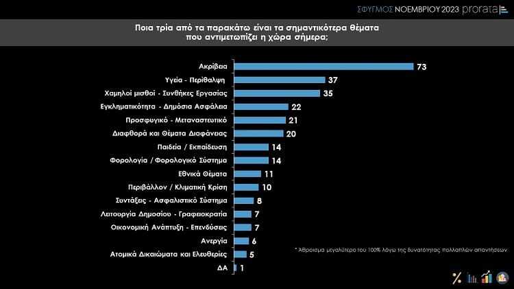 Την ίδια στιγμή, το 69% αξιολογεί αρνητικά τη σημερινή οικονομική κατάσταση της χώρας και μόλις το 30% θετικά, ενώ ως σημαντικότερη κατά την τρέχουσα περίοδο πρόκληση ιεραρχείται η ακρίβεια και δευτερευόντως τα ζητήματα που αφορούν την Υγεία, τους χαμηλούς μισθούς και τις συνθήκες εργασίας. Συμπληρωματικά στον συναισθηματικό καμβά επί του οποίου εξελίσσονται τα πολιτικά, οικονομικά και κοινωνικά γεγονότα, τα αποτελέσματα αποκαλύπτουν τον κυρίαρχο ρόλο που διαδραματίζει το συναίσθημα της απογοήτευσης στην ελληνική κοινωνία.