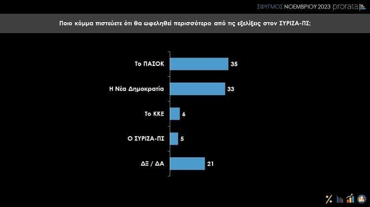 Σε σχέση με τις εξελίξεις που αφορούν στον ΣΥΡΙΖΑ-ΠΣ, η κοινή γνώμη θεωρεί ότι από την κατάσταση που επικρατεί θα ωφεληθεί κυρίως το ΠΑΣΟΚ (35%) και η ΝΔ (33%), την ίδια στιγμή που το 24% εκτιμάει ότι οι πρόσφατες αποχωρήσεις στελεχών θα ωφελήσουν τελικά τον ΣΥΡΙΖΑ-ΠΣ, ενώ το 69% ότι θα τον ζημιώσουν. Παράλληλα, το 42% της κοινής γνώμης θεωρεί ότι υπάρχει ανάγκη δημιουργίας ενός νέου αριστερού κοινοβουλευτικού κόμματος, άποψη που συμμερίζεται και το 44% όσων ψήφισαν ΣΥΡΙΖΑ-ΠΣ τον Ιούνιο του 2023. Τέλος, το 11% της κοινής γνώμης θεωρεί απόλυτα (4%) ή αρκετά (7%) πιθανό ότι θα ψήφιζε στις επόμενες εκλογές ένα κόμμα που θα δημιουργούνταν από στελέχη που αποχωρούν αυτή την περίοδο από το κόμμα της αξιωματικής αντιπολίτευσης.