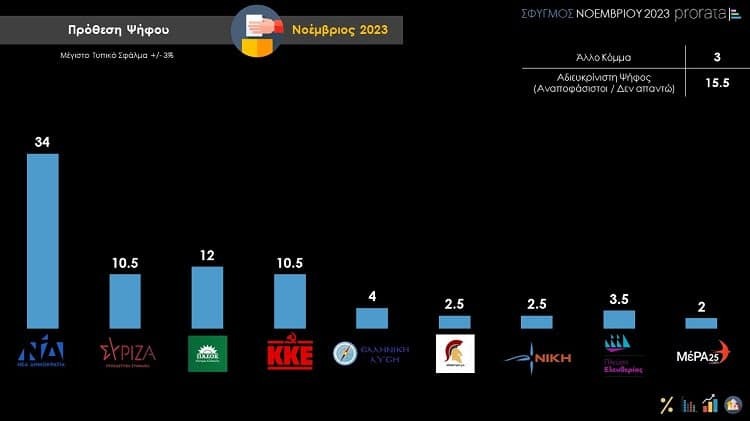 Πιο συγκεκριμένα, στον δείκτη μέτρησης της πρόθεσης ψήφου (χωρίς άκυρο-λευκό και αποχή) η εκλογική επιρροή της ΝΔ ανιχνεύεται στο 34%, του ΠΑΣΟΚ στο 12%, του ΣΥΡΙΖΑ-ΠΣ και του ΚΚΕ στο 10,5%, της Ελληνικής Λύσης στο 4%, της Πλεύσης Ελευθερίας στο 3,5%, της Νίκης και των Σπαρτιατών στο 2,5%, του ΜεΡΑ25 στο 2%, ενώ το ποσοστό όσων δηλώνουν αναποφάσιστοι ανέρχεται στο 15,5%.