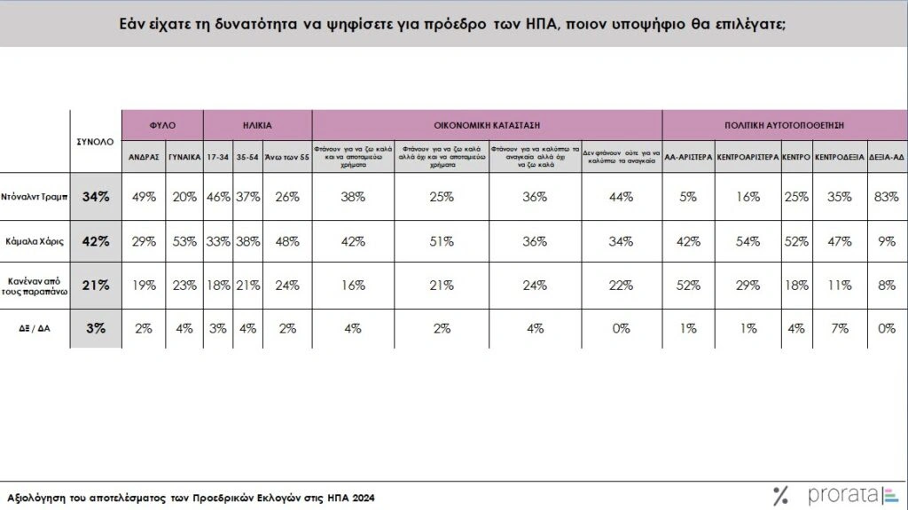 Η Χάρις έχει περισσότερες γυναίκες υποστηρίκτριες (53%) έναντι του Τραμπ (20%), ενώ ο Ρεπουμπλικάνος πολιτικός συγκινεί περισσότερο τις νεώτερες ηλικίες (46%) έναντι (33%) της Χάρις.