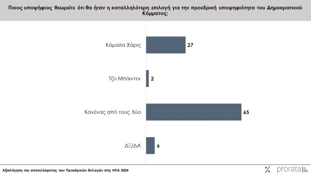 Σχεδόν ο ένας στους τρεις (27%) προτιμούσε την Κάμαλα έναντι του Τζο Μπάιντεν, ωστόσο, ένα συντριπτικό 65% δεν θα προτιμούσε κανέναν. «Εντυπωσιάστηκα από αυτή τη διαφάνεια», λέει ο Μπρέιντι. «Αυτό είναι πολύ σημαντικό στατιστικό γιατί αντιπροσωπεύει το γεγονός ότι οι Έλληνες, όπως και όλοι οι άλλοι, πιστεύουν ότι ο Μπάιντεν ήταν πολύ μεγάλος ηλικιακά για να είναι επιτυχημένος υποψήφιος, αλλά η εσωτερική διαδικασία με την οποία το Δημοκρατικό Κόμμα συσπειρώθηκε γύρω από την Καμάλα Χάρις, δεν είναι μια διαδικασία που θα λειτουργούσε για τους ξένους και οι Έλληνες τα βλέπουν απ΄ έξω».