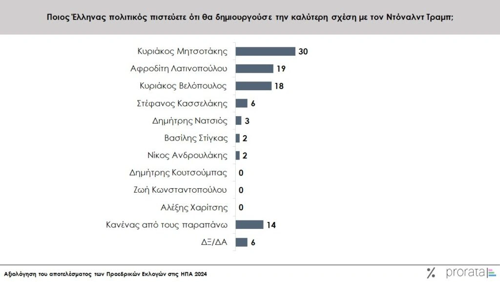 Τον Κυριάκο Μητσοτάκη θεωρεί το 30% ως τον Έλληνα αρχηγό κόμματος που μπορεί να συνεννοηθεί καλύτερα με τον νέο πρόεδρο των ΗΠΑ, Ντόναλντ Τραμπ. Δεύτερη έρχεται η Αφροδίτη Λατινοπούλου (19%) και τρίτος ο Κυριάκος Βελόπουλος (18%).