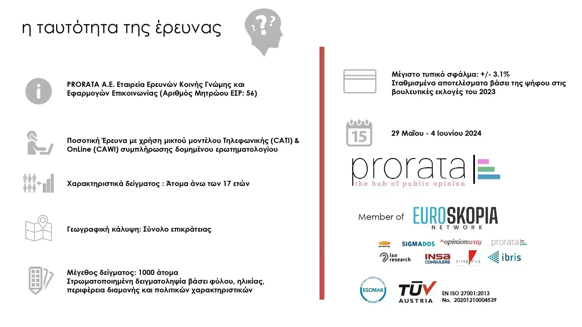 Η έρευνα διενεργήθηκε σε δείγμα πανελλαδικής κάλυψης 1000 ατόμων άνω των 17 ετών, το διάστημα 29 Μαΐου – 4 Ιουνίου 2024. Για τον σχεδιασμό της δειγματοληψίας ως στρώματα θεωρήθηκαν το φύλο, η ηλικία, ο τόπος διαμονής και η προηγούμενη εκλογική συμπεριφορά του υπό μελέτη πληθυσμού. Το μέγιστο τυπικό σφάλμα είναι +/-3,1%.