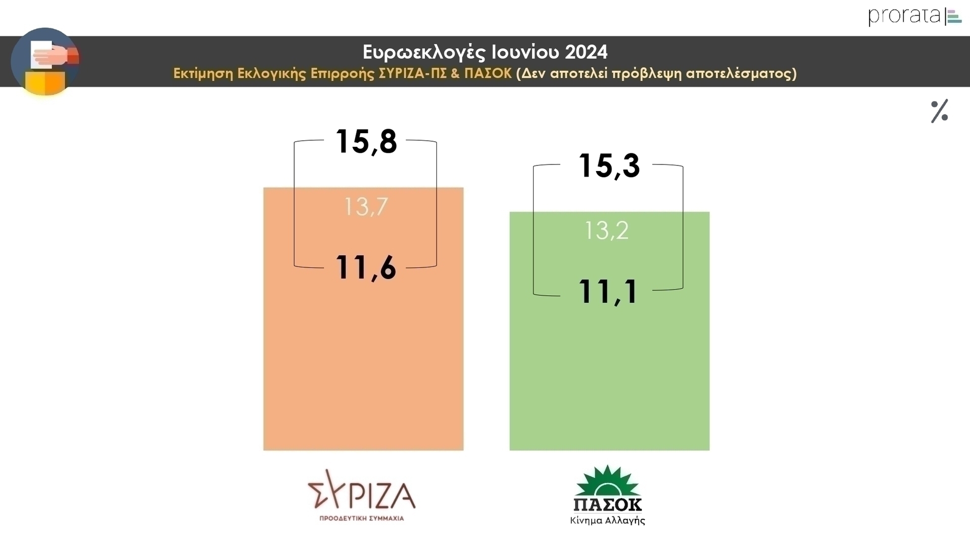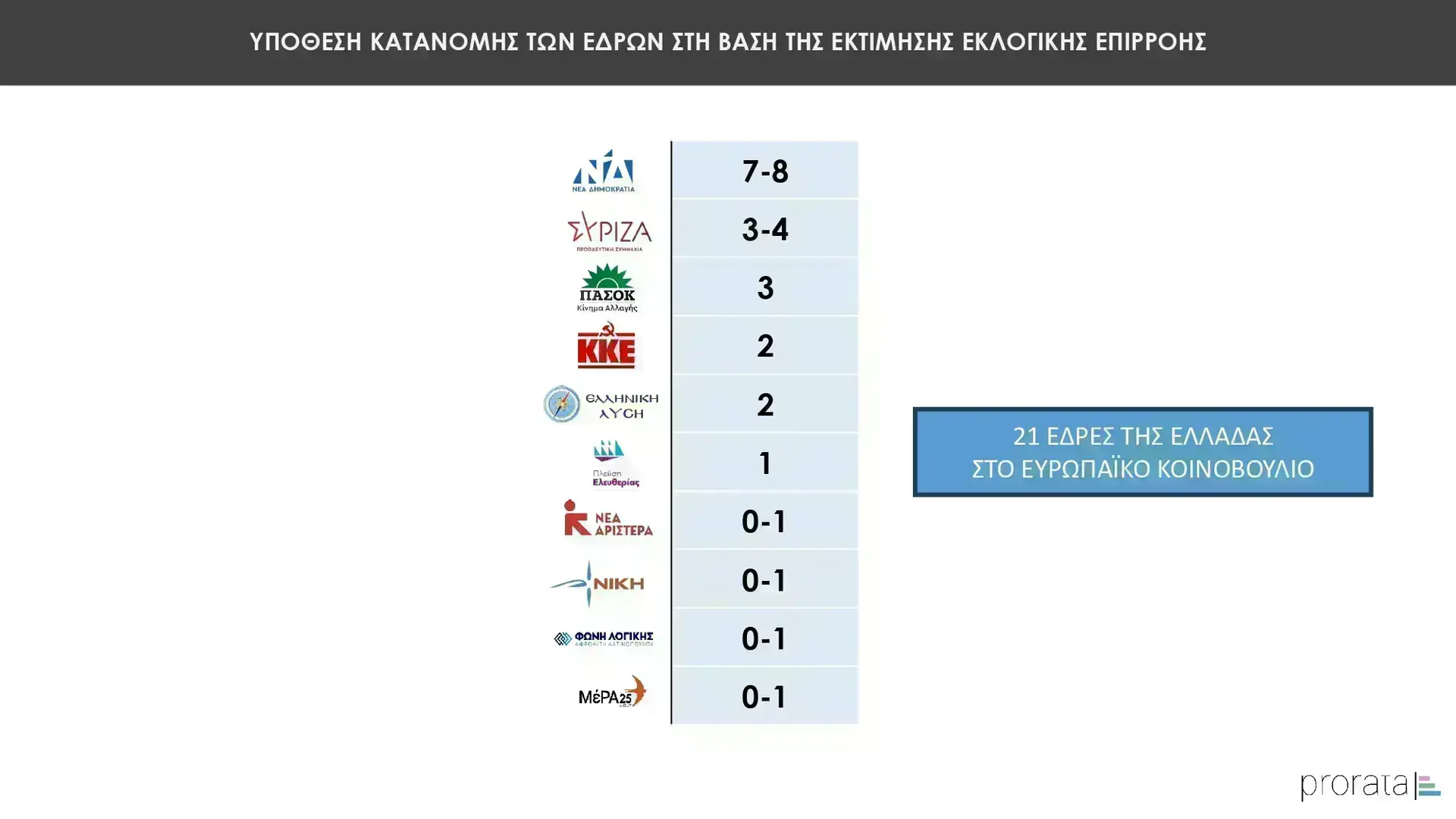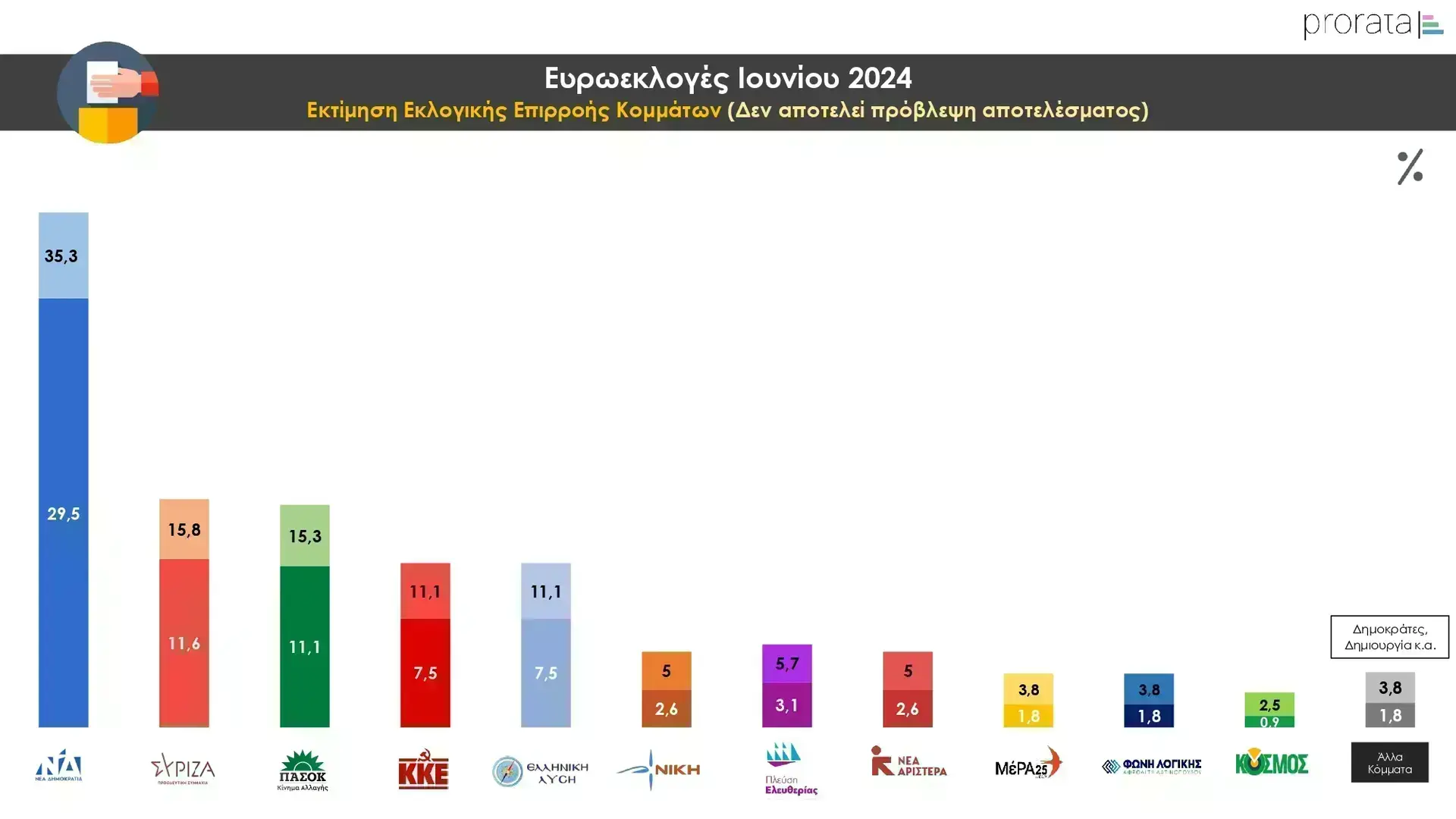 Ως προς τα σχετικά εύρη της τρέχουσας εκλογικής επιρροής των κομμάτων, η Prorata εκτιμάει ότι: