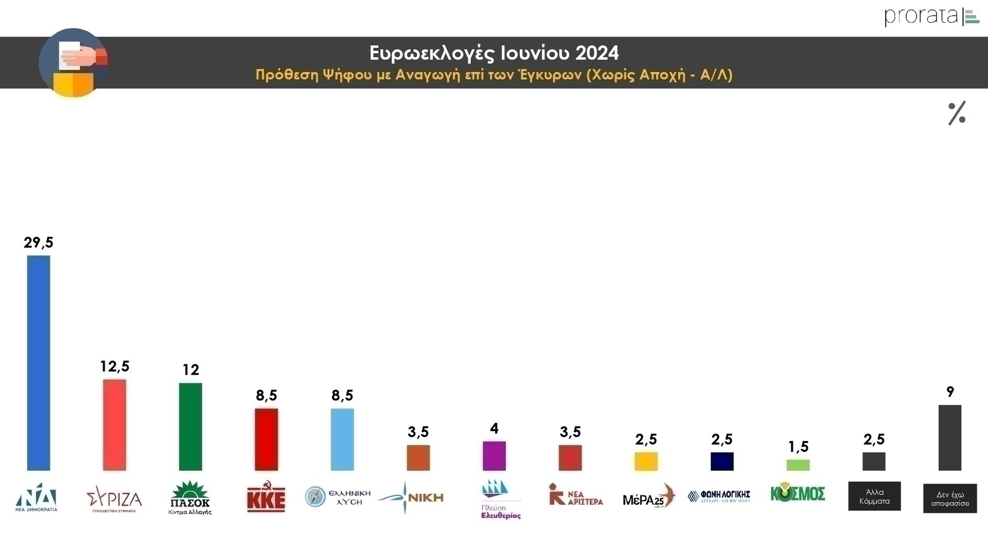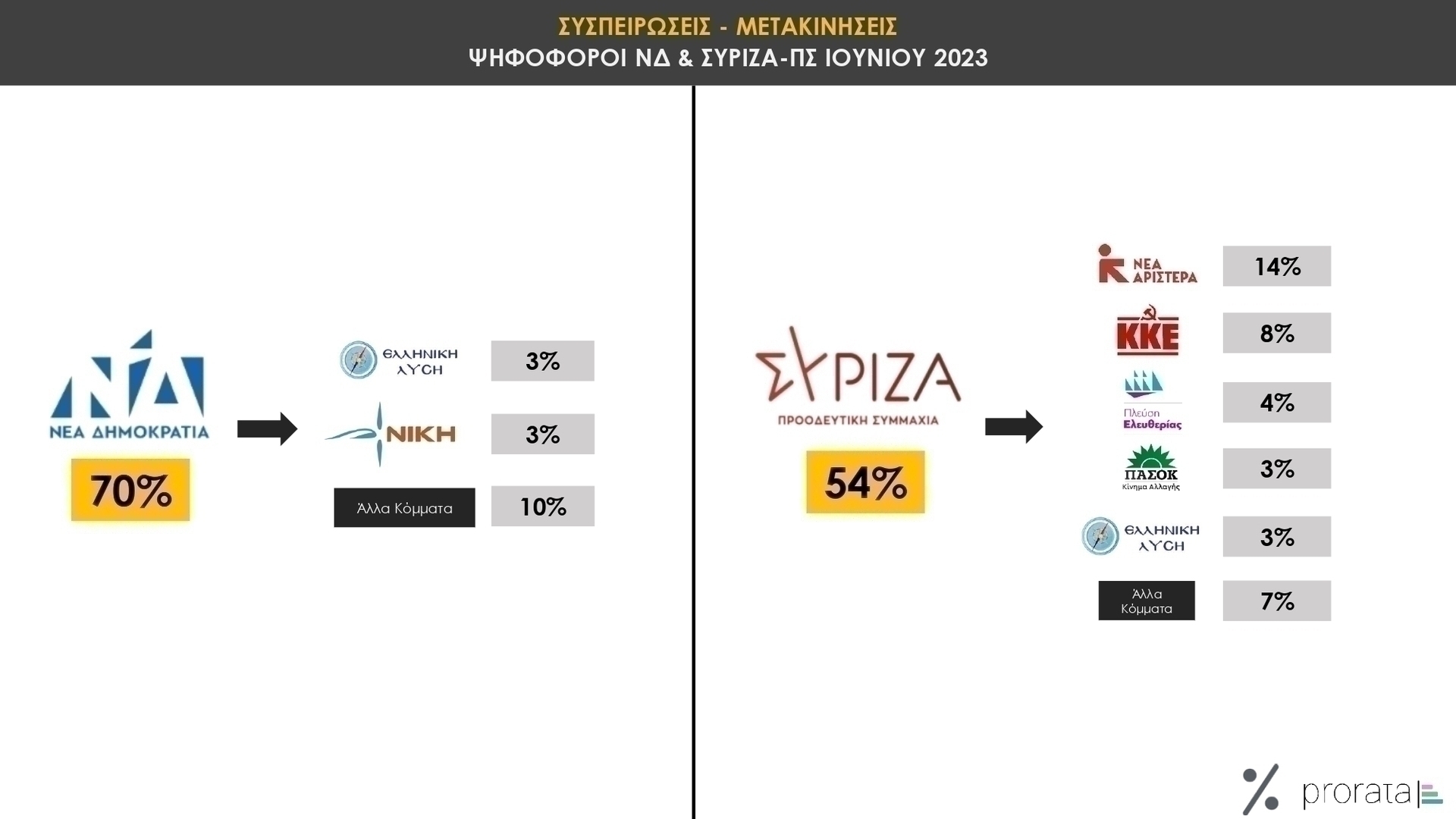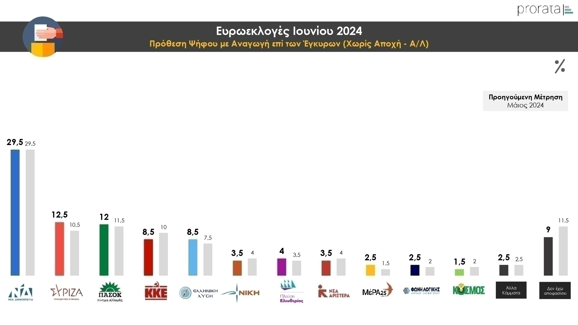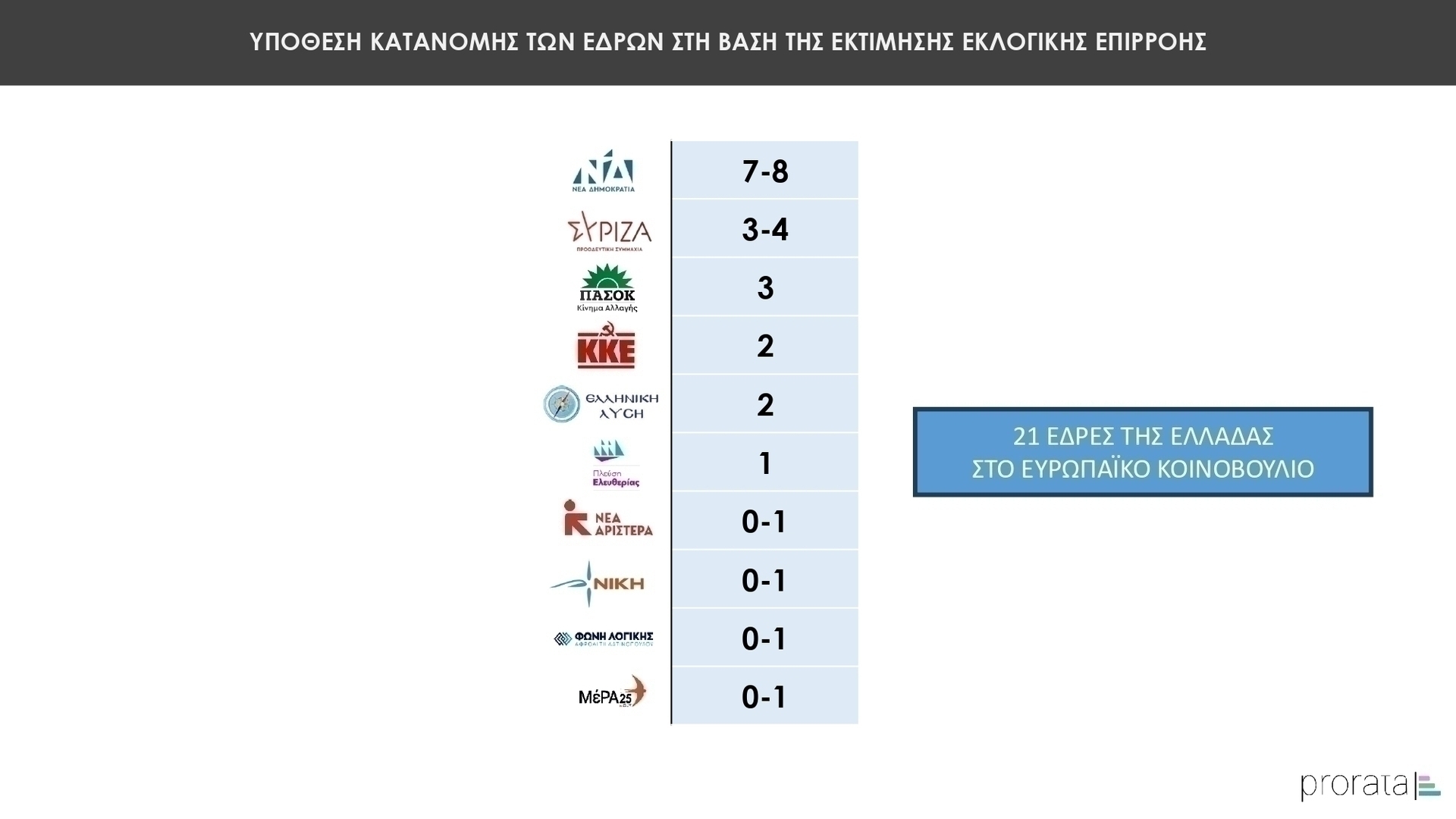 Ως προς τα σχετικά εύρη της τρέχουσας εκλογικής επιρροής των κομμάτων, η Prorata εκτιμάει ότι: