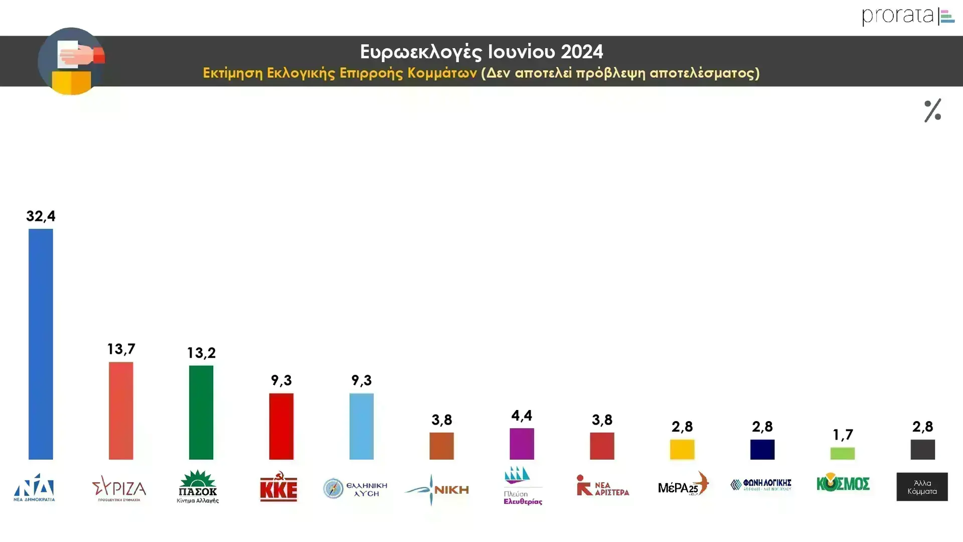Στη βάση των παραπάνω ορίων, η κεντρική τιμή της εκτίμησης για τη Νέα Δημοκρατία είναι 32.4%, για τον ΣΥΡΙΖΑ-ΠΣ 13.7%, για το ΠΑΣΟΚ-ΚΙΝΑΛ 13.2%, το ΚΚΕ και την Ελληνική Λύση 9.3%, τη Νίκη 3.8%, τη Νέα Αριστερά 3.8%, το ΜεΡΑ25 και τη Φωνή Λογικής 2.8%, ενώ για το Κόσμος 1.7%.