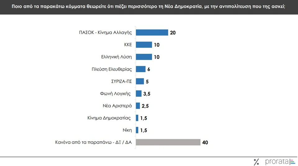 Τέλος, στην πλευρά της αντιπολίτευσης και στο ερώτημα, «ποιο κόμμα» πιέζει περισσότερο τη ΝΔ, το 20% λέει το ΠΑΣΟΚ, με το ΚΚΕ και την Ελληνική Λύση να ακολουθούν με 10% και την Πλεύση της Ζωής Κωνσταντοπούλου να ξεπερνά τον ΣΥΡΙΖΑ με 6%, έναντι 5% της πρώην (πλέον) αξιωματικής αντιπολίτευσης.