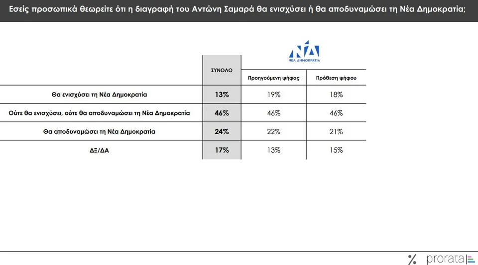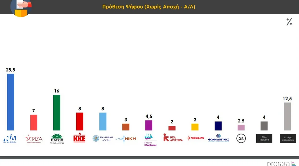 Στην πρόθεση ψήφου, η ΝΔ βρίσκεται στο 25,5% έναντι 16% του ΠΑΣΟΚ, ενώ με 8% ακολουθούν ΚΚΕ και Ελ. Λύση. Στην κατηγορία αυτή, μένει εκτός Βουλής ο Στ. Κασσελάκης