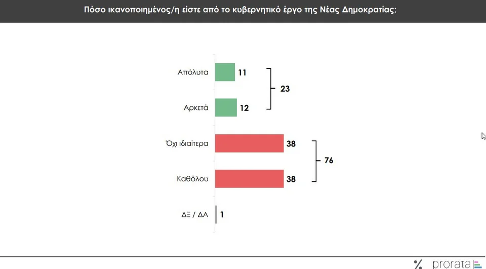 Επίσης, στο ερώτημα αν είναι ικανοποιημένοι από το έργο της ΝΔ στη κυβέρνηση, το 23% δήλωσε απόλυτα ή αρκετά και το 76% «καθόλου» ή «όχι και τόσο».