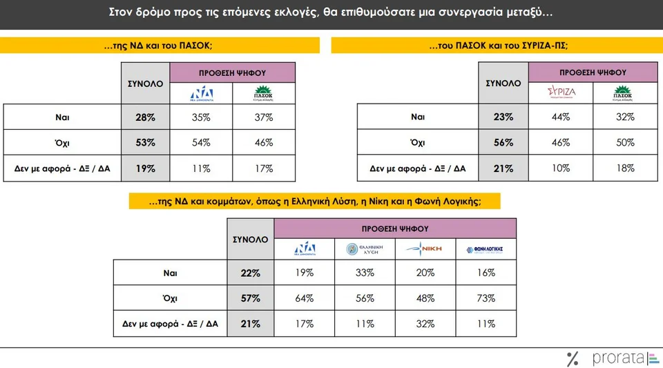 Ενα ενδιαφέρον αποτέλεσμα είναι οι προτιμήσεις των ερωτηθέντων για το ενδεχόμενο κυβερνητικού συνασπισμού. Στο αν θα επιθυμούσαν μια κυβερνητική συνεργασία μεταξύ ΝΔ και ΠΑΣΟΚ, οι ψηφοφόροι των δύο κομμάτων λένε «ναι», σε ποσοστό 35% και 37% αντίστοιχα.