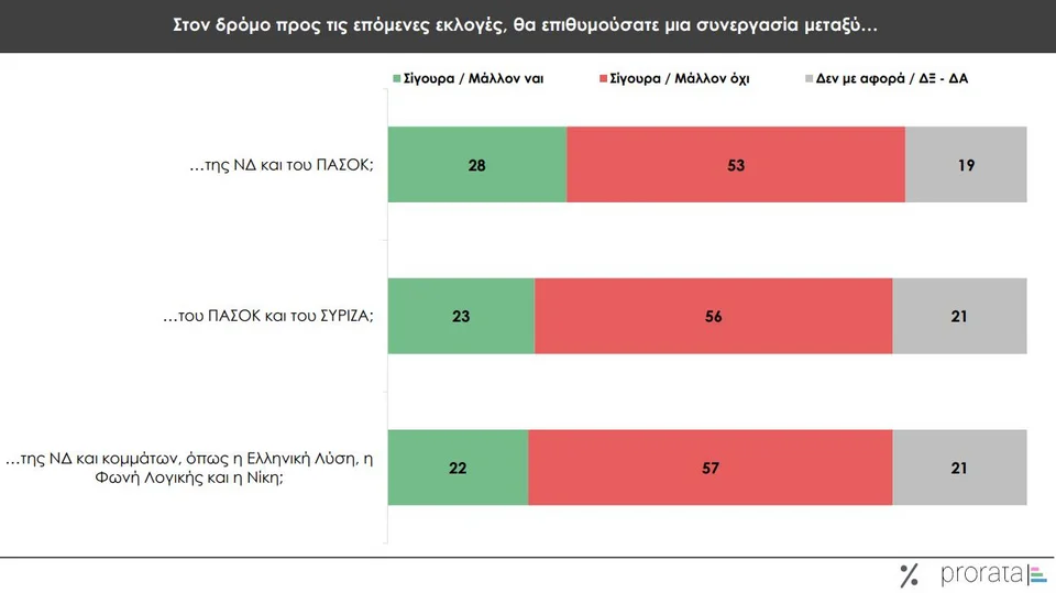 Δημοσκόπηση Prorata: Μοιρασμένοι σε ΠΑΣΟΚ και ΝΔ για κυβέρνηση συνεργασίας