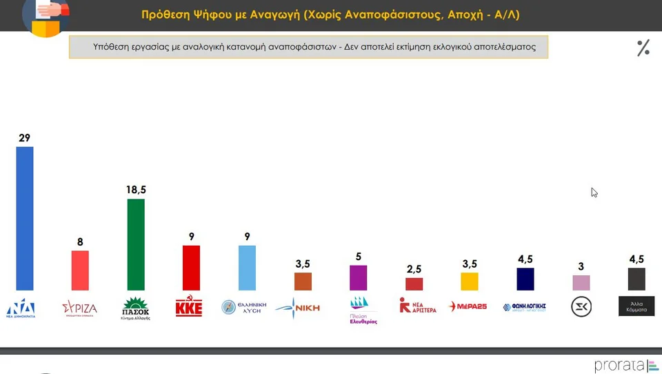 Στην πρόθεση ψήφου με αναγωγή, η Νέα Δημοκρατία έχει προβάδισμα 10,5 μονάδων έναντι του ΠΑΣΟΚ, ενώ βγάζει 10 κόμματα στη Βουλή. Συγκεκριμένα, συγκεντρώνει το 29%, έναντι 18,5% του ΠΑΣΟΚ, με το ΚΚΕ και την Ελληνική Λύση να είναι μαζί στην τρίτη θέση με 9% και τον ΣΥΡΙΖΑ να ακολουθεί με 8%. Η Πλεύση Ελευθερίας ακολουθεί με 5%, ενώ στο 4,5% είναι η Φωνή Λογικής, στο 3,5% το ΜεΡΑ25 και οριακά με 3% δείχνει εντός Βουλής το κόμμα του Στ. Κασσελάκη.