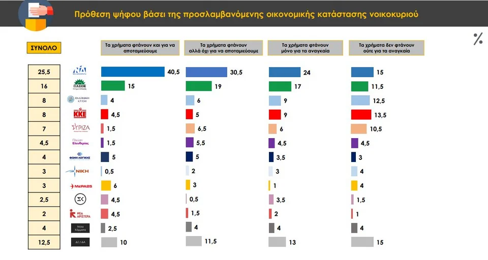Οσον αφορά την πρόθεση ψήφου βάσει της οικονομικής τους κατάστασης, δεν υπάρχουν διαφοροποιήσεις, με εξαίρεση την κατηγορία αυτών που δηλώνουν πως δεν τα βγάζουν πέρα, οι οποίοι αναδεικνύουν δεύτερο κόμμα το ΚΚΕ, τρίτη την Ελ. Λύση και 4ο το ΠΑΣΟΚ.