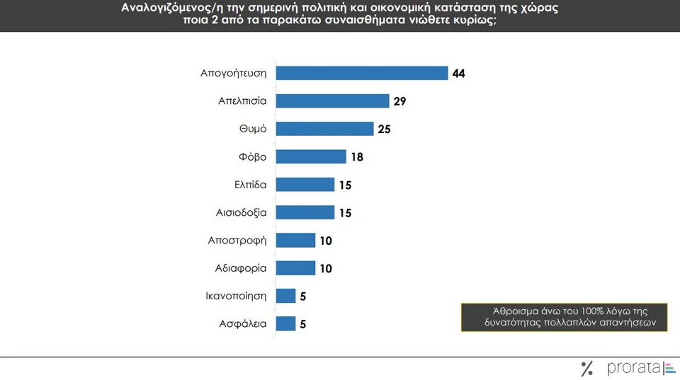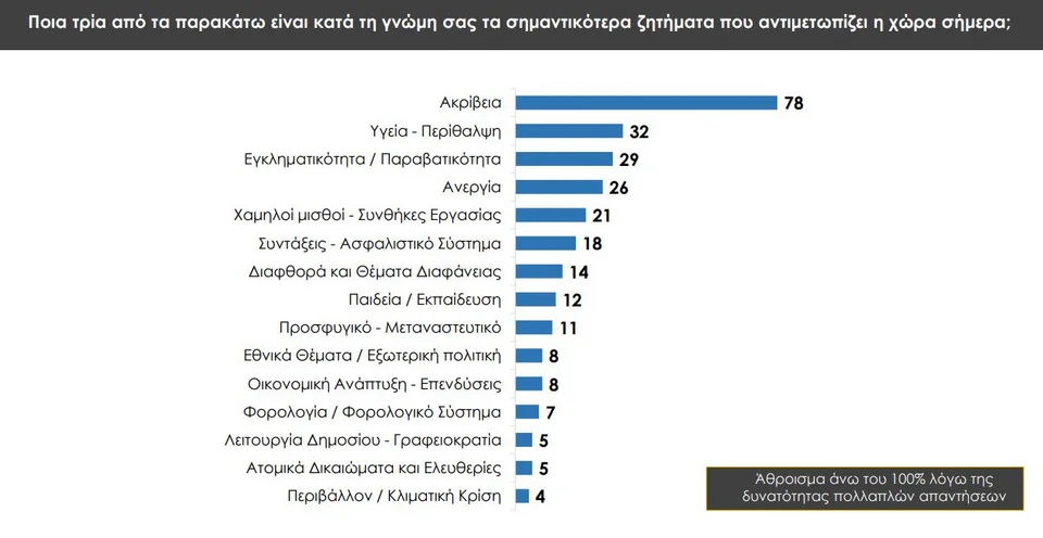 Στο ερώτημα «ποια είναι τα σημαντικότερα προβλήματα» στη χώρα, το 78% λέει η ακρίβεια, ενώ πολύ πίσω είναι η υγεία (32%) και η εγκληματικότητα (29%), με τέταρτη την ανεργία (26%) και αμέσως μετά τους μισθούς (21%)