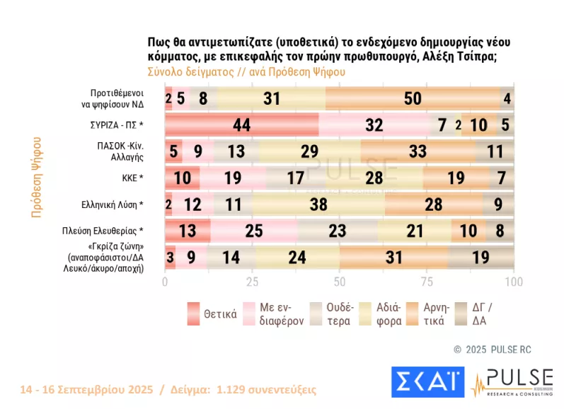 Μεγάλο ενδιαφέρον παρουσιάζουν οι απαντήσεις για το κόμμα που εικάζεται ότι θα ανακοινώσει ο πρώην πρωθυπουργός και νυν βουλευτής του ΣΥΡΙΖΑ, Αλέξης Τσίπρας. Μόνο οι δύο στους 10 ερωτηθέντες θα ψήφιζαν ή θα κοίταζαν με ενδιαφέρον την ίδρυση ενός κόμματος από τον Αλέξη Τσίπρα, ενώ ένα 12%, δηλώνει ουδέτερο. Το 58% ωστόσο, παρουσιάζεται αρνητικό στο να ψηφίσει το κόμμα που ίσως να ιδρύσει ο πρώην πρωθυπουργός.