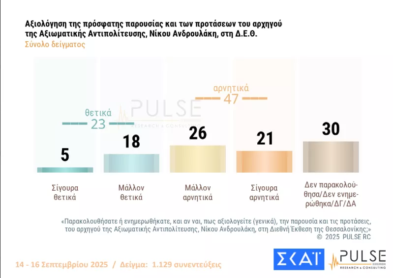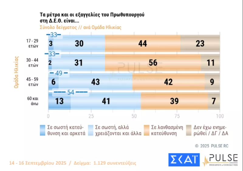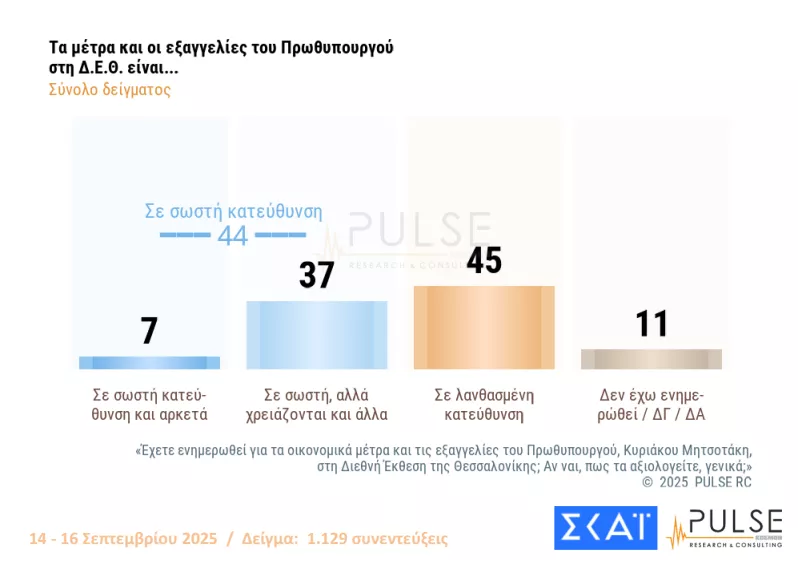 Όσον αφορά στην αξιολόγηση των μέτρων που ανακοίνωσε ο πρωθυπουργός Κυριάκος Μητσοτάκης στη ΔΕΘ: Το 44% θεωρεί πως βρίσκονται προς τη σωστή κατεύθυνση, ενώ το 45% θεωρεί ότι τα μέτρα βρίσκονται σε λανθασμένη κατεύθυνση. ΄