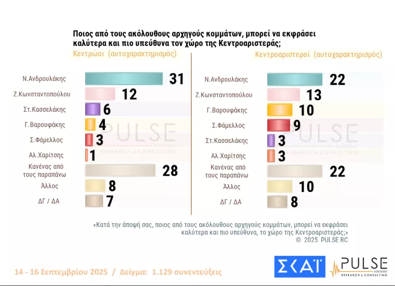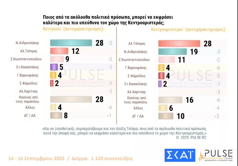 Η δημοσκόπηση της Pulse έθεσε και το ερώτημα για τον καλύτερο εκφραστή της κεντροδεξιάς, στο πλαίσιο της συζήτησης για τη δημιουργία ενός φορέα, που θα περιλαμβάνει όλα τα κόμματα από το κέντρο προς τα αριστερά, ως αντιστάθμισμα στη δυναμική της Νέας Δημοκρατίας. Το ενδιαφέρον σκέλος είναι η λίστα με το όνομα του Αλέξη Τσίπρα. Ο πρώην πρωθυπουργός φαίνεται να έχει το προβάδισμα στην εκτίμηση του συνόλου. Στους κεντρώους υπολείπεται του Νίκου Ανδρουλάκη, ενώ στους κεντροαριστερούς ο Αλέξης Τσίπρας βρίσκεται στην πρώτη θέση των προτιμήσεων.