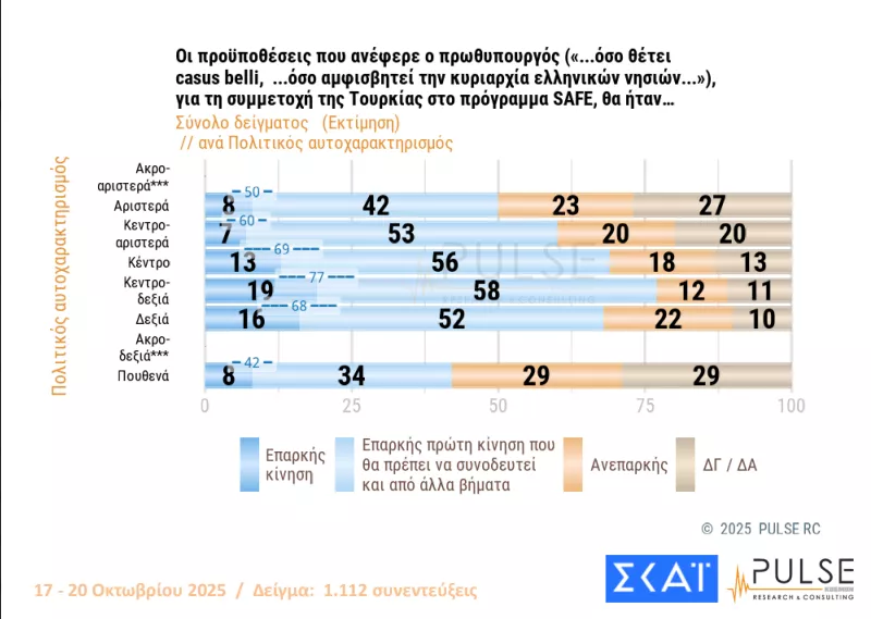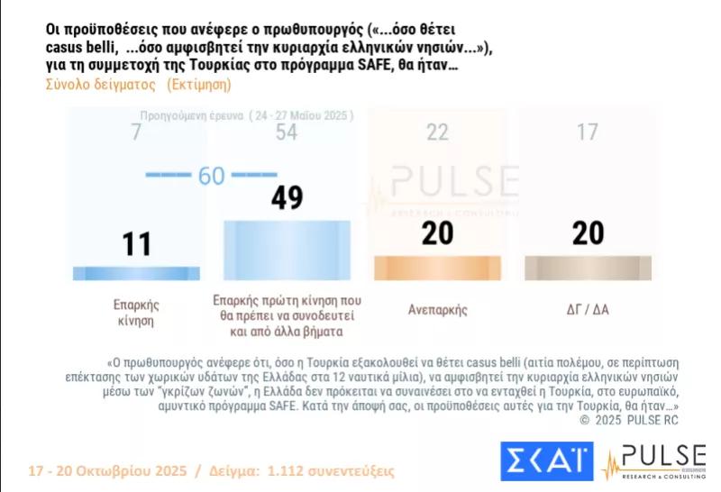 Ως επαρκή κρίνει το 60% των ερωτηθέντων την τακτική της κυβέρνησης, με τους όρους για άρση του casus belli, απέναντι στο ενδεχόμενο ένταξης της Τουρκίας στο ευρωπαϊκό πρόγραμμα άμυνας SAFE.