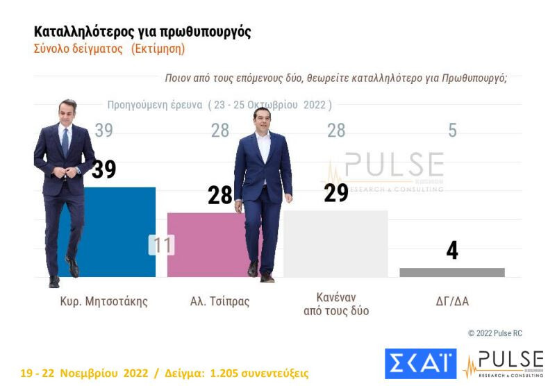 Όσον αφορά τη σύγκριση «καταλληλότητας» ανάμεσα στον Κυριάκο Μητσοτάκη και τον Αλέξη Τσίπρα, ως βασικούς διεκδικητές της εξουσίας στις επερχόμενες εκλογές, ο πρόεδρος της Νέας Δημοκρατίας συγκεντρώνει ποσοστό 39% για καταλληλότερος πρωθυπουργός, έναντι 28% που συγκεντρώνει ο Αλέξης Τσίπρας. Ωστόσο, εντύπωση προκαλεί η απάντηση «κανένας από τους δύο», η οποία συγκεντρώνει πσοοστό 29%, ήτοι μία ποσοστιαία μονάδα πάνω από τον πρόεδρο του ΣΥΡΙΖΑ.