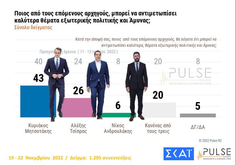 Στο ερώτημα για το ποιος από τους τρεις αρχηγούς των κομμάτων είναι καταλληλότερος να χειριστεί τα «καυτά» θέματα της ενεργειακής κρίσης, της οικονομίας και της εξωτερικής πολιτικής, ο Κυριάκος Μητσοτάκης υπερτερεί με μεγάλη διαφορά έναντι των πολιτικών του αντιπάλων Αλέξη Τσίπρα και Νίκο Ανδρουλάκη.