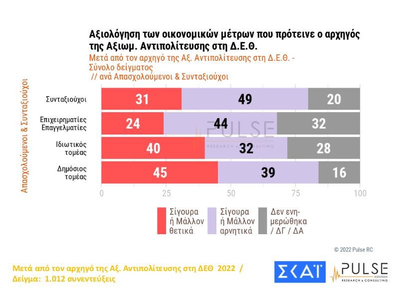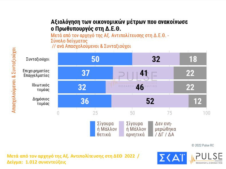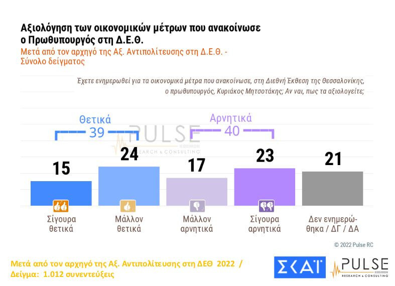 Αντιστοίχως μοιρασμένα είναι τα ποσοστά αξιολόγησης για τα μέτρα που ανακοίνωσε ο πρωθυπουργός Κυριάκος Μητσοτάκης στη ΔΕΘ, προκειμένου να αντιμετωπιστούν οι συνέπειες της ενεργειακής κρίσης και η ακρίβεια.