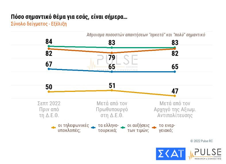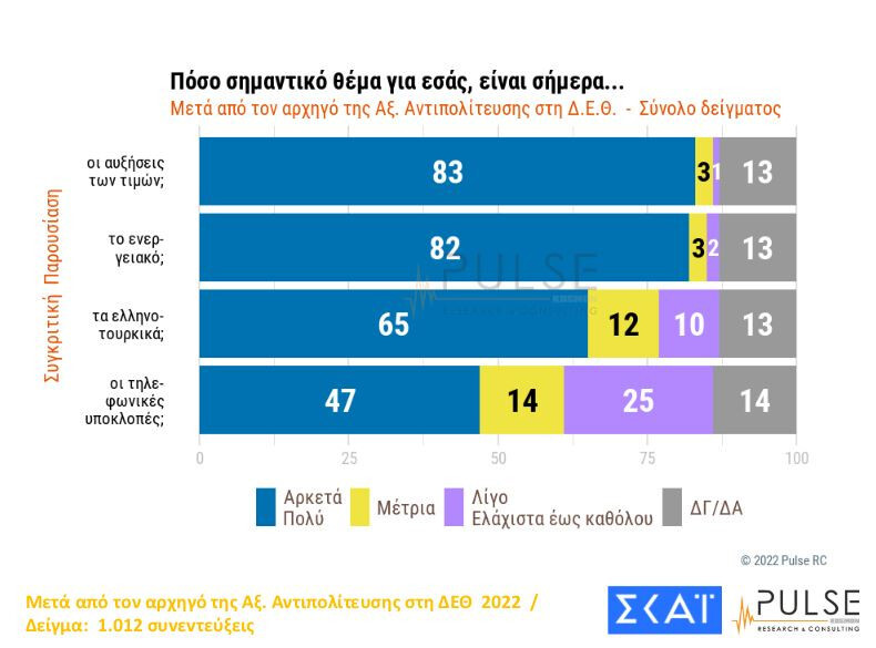 Η έρευνα ανέδειξε σε συντριπτικό ποσοστό τις αγωνίες των Ελλήνων πολιτών για την ακρίβεια και την ενέργεια, κατά κύριο λόγο, αλλά και για τα ελληνοτουρκικά, με τις διαδοχικές απειλές και τις προκλητικές ενέργειες των γειτόνων. Σε μικρότερο ποσοστό, αλλά σημαντικό, απασχολούν και οι υποκλοπές.